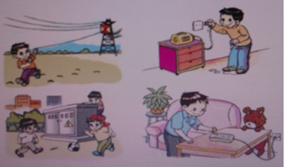 请看下图,并回答以下问题。问题(一):图中的学生在安全用电方面犯了哪些常识性错误?(4分) 问题(二):你认为小学教师应从哪些方面进行安全教育?(6分)