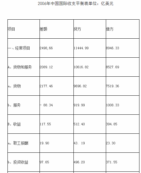 下表是已公布的2006年我国国际收支平衡表简表,请根据此表在下列备选答