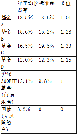 基金 A、基金 B、基金C和基金 D,以及沪深300ETF基金和国债的表现情况的数据如表 所示。 表 基金 A、 B、 C、D。沪深300ETF基金和国债的表现情况若张先生三年前将40%的资金投资于基金 A,60%的资金投资于基金 B,并持有至今,该投资组合的年平均收益率为( )。