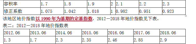 (2018年真题)某企业拟转让一项工业房地产,委托资产评估机构进行评估,评估基准日为2016年6月30日,资产评估机构现场调查后,拟对建筑物拟采用重置成本法,对土地使用权采用基准地价系数修正法进行评估。 该工业房地产情况如下:建筑面值4650平方米,2010年6月30日建成并投入使用,经济寿命年限为40年,截止目前正常使用,经评估,重置单价为3500元/平方米,用打分法确定的建筑物成新率为78%。 房地产用地于2008年6月30日通过出让方式取得,位于某地区三类地价区,土地面积2500平方米,出让年限50年,用地性质为工业用途,土地开发程度达到六通一平。该地区三类地价区的工业用地基准地价为650元/平方米,基准地价内涵为六通一平,50年期出让土地使用权,平均容积率为2.0,基准地价的基准日期为2012年6月30日。 根据基准地价资料,容积率修正系数见下表: 表一:影响地价的其他因素修正系数为1.0500,土地资本化率为6%,不考虑交易环节税费要求: (1)简述采用基准地价系数修正法的前提条件。 (2)计算土地使用权评估单价(元/平方米),保留4位小数。 (3)若打分法和年限法权重比为6:4,计算建筑物综合成新率(%)。 (4)计算建筑物评估值,委估资产评估值。