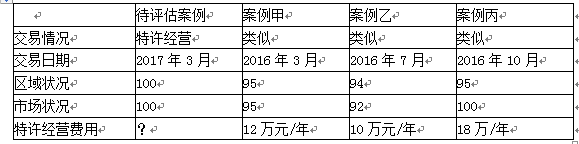 A企业是一家著名企业,其市场开拓采取特许加盟的方式。现在准备在甲市建—个特许加盟企业,要求评估特许加盟费用。为了进行准确的评估,经过调查,找到了临近城市近期特许加盟企业案例,基本情况如下表所示(折现率为6%)。试评估其特许经营价值。