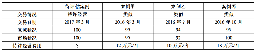 A企业是一家著名企业,其市场开拓采取特许加盟的方式。现在准备在城市甲建一个特许加盟企业,要求评估特许加盟费用。为了进行准确的评估,经过调查,找到了临近城市近期特许加盟企业案例,基本情况如下表所示(折现率为6%)。试评估其特许经营价值。(2016年3月至2017年3月,消费物价水平每月上涨0.5%)