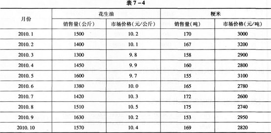 某粮油零售市场2010年1月至1o月花生油和粳米的销售量及其市场价格如表7—4所示。