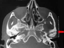 患儿,5岁,外伤后逐渐出现张口困难,咬合关系错乱,髁突动度减弱,外观及X 线检查结果如图。最可能的诊断是 ( )![]()