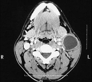 图示是鳃裂囊肿患者的CT 检查结果,关于此病的描述错误的是 ( )