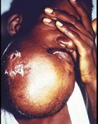 患者男性,36岁。右侧下颌区无痛性肿胀逐渐加重八月,无疼痛及麻木感。检查见面部不对称,右侧下颌区膨隆。表面皮肤色、温正常。口内相应区域移行沟丰满,触诊有乒乓球感,穿刺可抽出褐色液体,显微镜下未见胆固醇晶体。