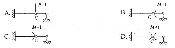 求图示梁铰C左侧截面的转角时,其虚拟单位力状态应取:![]()