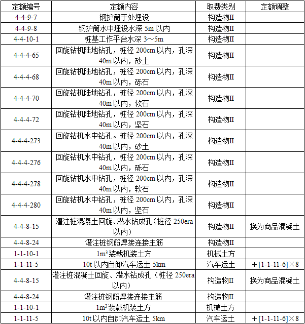 某预应力小箱梁梁桥,桥跨组合为22×30m,基础采用(M80cm灌注桩(回旋钻法),除10号墩桩基长为45m外,其他桩基均长为35m。桥台采用扶壁式桥台,桥墩采用圆柱式桥墩,有系梁支撑。除10号墩为水中施工(水深4~5m)外,其余均为非水中施工。混凝土采用商品混凝土,泵送。水上混凝土施工考虑便桥施工方法,便桥费用不计。桩基工期5个月。土方运距5km。 本项目基础所涉及的定额、定额编号、取费类别、定额调整的相关内容见表4-35。 表4-35项目基础所涉及的定额、定额编号、取费类别、定额调整的相关内容【问题】 请审查所列内容有何处需修正。