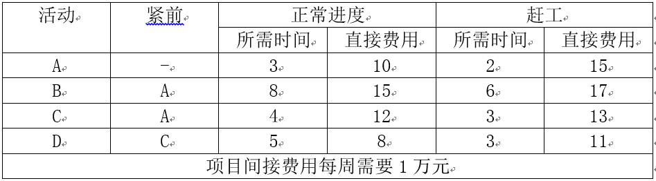 某项工程的活动明细如下表(时间:周;费用:万元):