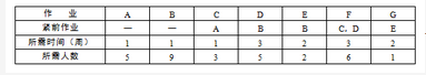 F、G七个作业,各个作业的紧前作业、所需时间、所需人数如下表: