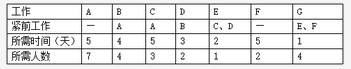 F、G七项工作,各工作的紧前工作、所需时间以及所需人数如下表所示(假设每个人均能承担各项工作)按此工期,整个工程最少需要( )人。