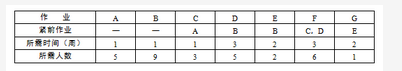 F、G七个作业,各个作业的紧前作业、所需时间、所需人数如下表:
