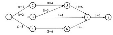 B、……、J,其中PERT图如下所示(A=1表示任务A的持续时间是1天),则项目X的关键路径是( )