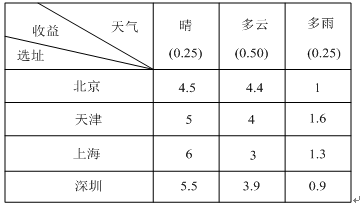 某公司希望举办一个展销会以扩大市场,选择北京、天津、上海、深圳作为候选会址。获利情况除了会址关系外,还与天气有关。天气可分为晴、多云、多雨三种。通过天气预报,估计三种天气情况可能发生的概率为0.25、0.50、0.25,其收益(单位:人民币万元)情况见下表。使用决策树进行决策的结果为 ( )。