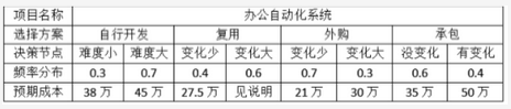 某机构拟进行办公自动化系统的建设,有四种方式可以选择:①企业自行从头开发;②复用已有的构件;③外购现成的软件产品;④承包给专业公司开发。针对这几种方式,项目经理提供了如下表所示的决策树。其中在复用的情况下,如果变化大则存在两种可能,简单构造的概率为0.2,成本约31万元;复杂构造的概率为0.8,成本约49万元。据此表,管理者选择建设方式的最佳决策是( )。