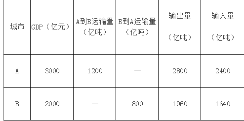 A、B两个中心城市有关数据如下表所示,试计算两市间的运输联系强度Hab( )。