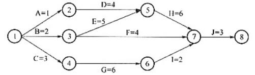 B、……、J,其中PERT图如下所示(A=1表示任务A的持续时间是1天),则项目X的关键路径是( )。