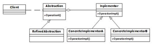 下图是(请作答此空)设计模式的类图,该设计模式的目的是( ),图中,Abstraction和RefinedAbstraciton之间是( )关系,Abstraction和Implementor之间是( )关系。