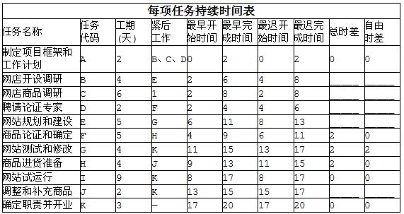 阅读以下说明,根据要求回答下面问题[说明]赵新锐是一名大学生,他申请了学校的大学生创新创业项目,计划建立一个网上商店,他制定的工作计划如下表所示。12、按照上表,填写下表中各项任务的总时差和自由时差。