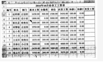某公司 2016 年 10 月员工工资表如下所示。若要计算员工的实发工资,可先在 J3 单元格中输入(),再向垂直方向拖动填充柄至 Jl 2 单元格,则可自动算出这些 员工的实发工资。若要将缺勤和全勤的人数统计分别显示在 B13 和 D13 单元格中,则可 B13 和D13 中分别填写(作答此空)。