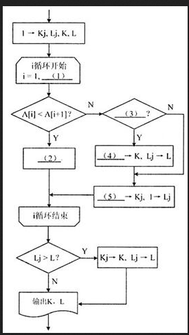 下面流程图的功能是:在给定的一个整数序列中查找最长的连续递增子序列。设序列存放在数组A[1:n](n≥2)中,要求寻找最长递增子序列A[K:K+L-1](即A[K]<A[K+1]<…<A[K+L-1])。流程图中,用Kj和Lj分别表示动态子序列的起始下标和长度,最后输出最长递增子序列的起始下标K和长度L。