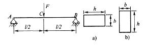 矩形截面简支梁中点承受集中力F。若h=2b,分别采用图a)、图b)两种方式放置,图a)梁的最大烧度是图b)梁的: