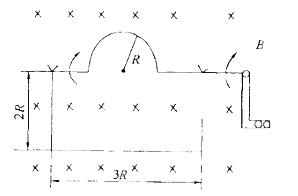 用一根硬导线弯成半径为R的半圆形,将其置于磁感应强度为B的均匀磁场中,以频率f旋转,如图所示,这个导体回路中产生的感应电动势ε等于:![]()