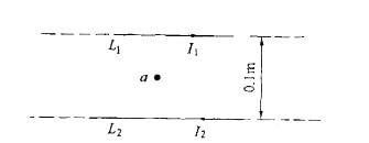 真空中有两根互相平行的无限长直导线L1和L2,相距0.1m。通有方向相反的电流,I1=20