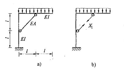 如图a)所示结构,若将链杆撤去,取图b)为力法基本体系,则力法方程及知分别为: