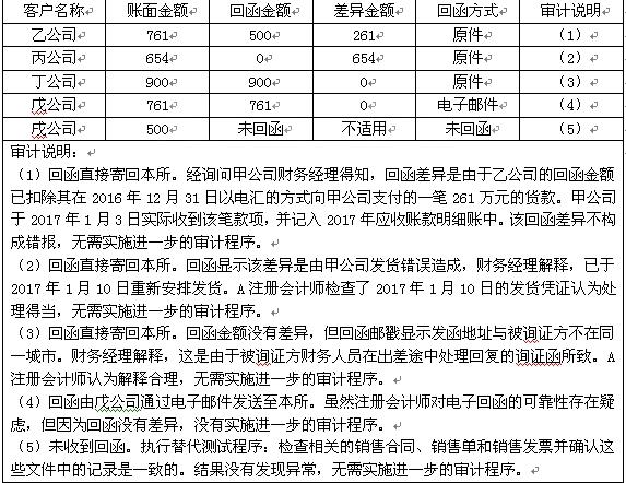 ABC会计师事务所承接甲公司2016年财务报表审计。A注册会计师选取5个应收账款明细账户,对截至2016年12月31日的余额实施积极式函证,并根据回函结果编制了应收账款函证结果汇总表。有关内容摘录如下: