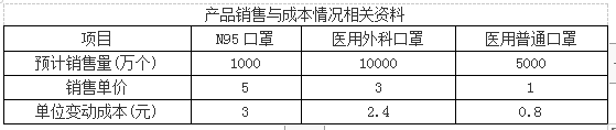 某企业计划生产N95口罩、医用外科口罩、医用普通口罩三种产品,固定成本总额为2250万元,它们的销售量、销售单价、单位变动成本资料如下表所示。
