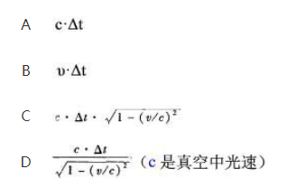 宇宙飞船相对于地而以速度v作匀速直线飞行。某一时刻飞船头部的宇航员向飞船尾部发出一个光讯号,经过Δt(飞船上的钟测量)时间后,被尾部的接收器收到。由此可知飞船的固有长度为( )。![]()