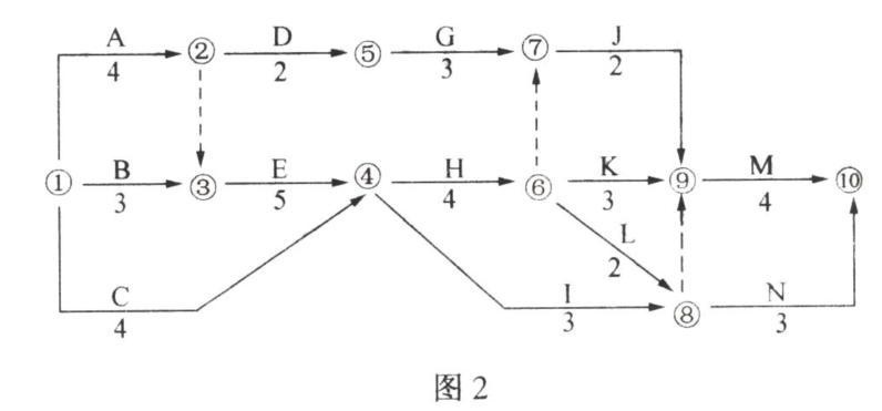 某委托监理的工程,施工合同工期为20个月,土方工程量为2800m3,土方单价为18元/m3。施工合同中规定,土方工程量超出原估计工程量15%时,新的土方单价应调整为15元/m3。经监理工程师审核批准的施工进度计划如图2所示(时间单位:月)。其中工作A、E、J共用一台施工机械且必须安顺序施工。