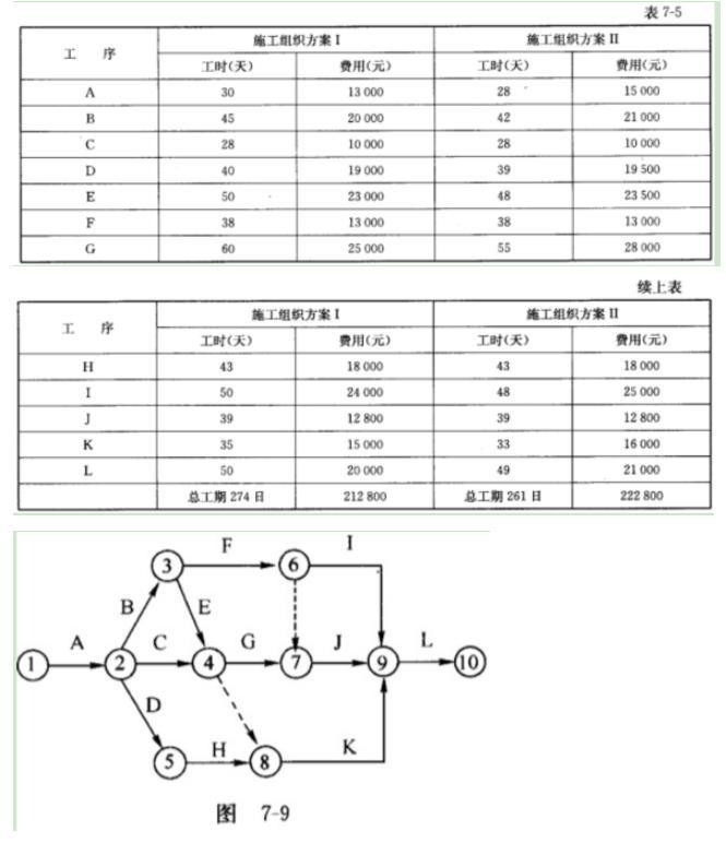某工程施工各工序组织网络计划见图7-9,各工序工时与费用如表7-5所示。施工合同约定合同工期为270天,工期延误一天罚3000元,提前一天奖励1000元。 【问题】2、如果两种可混合组织(即一部分工序按方案I组织,而另一部分按方案II组织),试确定最佳组织方案。